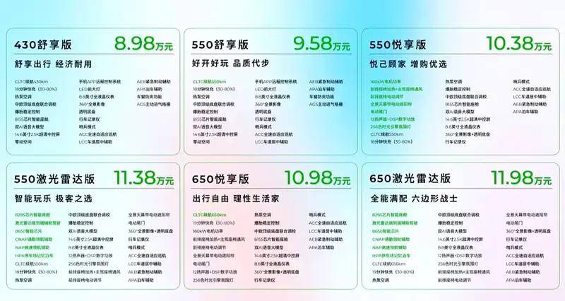 其次就是10.38万元的550悦享版,相比于上一个版本又贵了8000元,但是这个价格下提升了电机功率达到了160kw,最大马力218匹,动力电池供应商是来自国轩高科/中创新航/蜂巢能源/正力新能的56.2度的磷酸铁锂,CLTC续航还是550km。